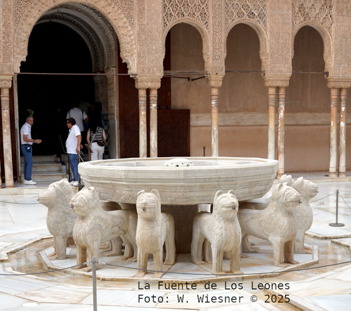Die Alhambra ist sowohl ein historisches Denkmal als auch das Erbe der sieben Jahrhunderte arabischer Kultur im Süden Spaniens. El Palacio de los Leones es un ejemplo de la integración del agua a la arquitectura, porque viaja por todo el palacio desde la Fuente de los Leones. Der Löwenpalast ist ein Beispiel für die Integration von Wasser in die Architektur, denn es fliesst vom Löwenbrunnen aus durch den gesamten Palast.